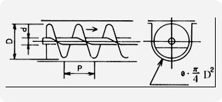 Qm = 60*φ*(π/4)(D2-d2)*N*P Qm = conveyance capability(m3/h) d = outer diameter of shaft(m) P = SCREW PITCH (m) < 0.5~1D> N = R.P.M (MIN) φ= repletion efficiency(15%~45%)