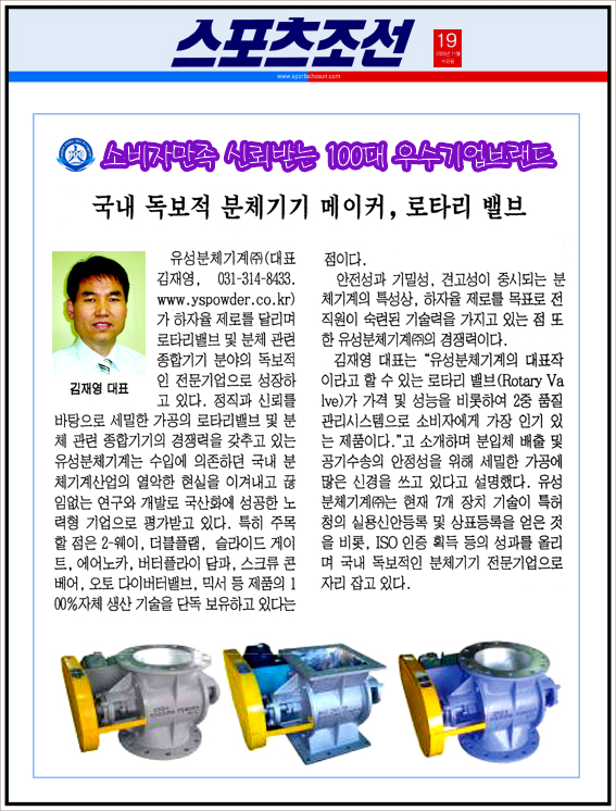 "스포츠조선" 신뢰받는 100大 우수기업