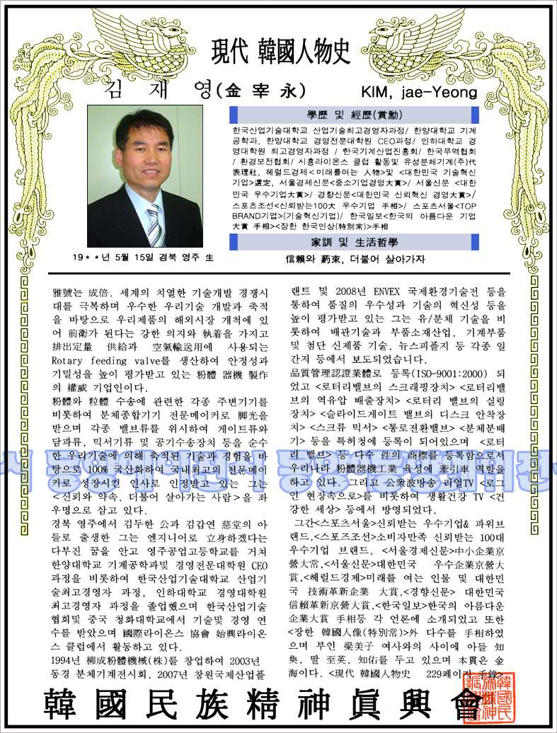 김재영 "現代 韓國 人物史" 수록 페이지 정보 작성자 홈관리자 댓글 0건 조회 3,898회 작성일 09-02-26 20:14 본문 한국민족정신진흥회 발간한 한국을 빛낸 "現代 韓國人物史" 의 229페이지에 대표이사 김재영께서 수록 되었습니다. 목록 이전글'한국일보"한국의 아름다운 기업대상 09.05.21 다음글"스포츠조선" 신뢰받는 100大 우수기업 08.11.25 댓글목록 댓글목록 등록된 댓글이 없습니다.