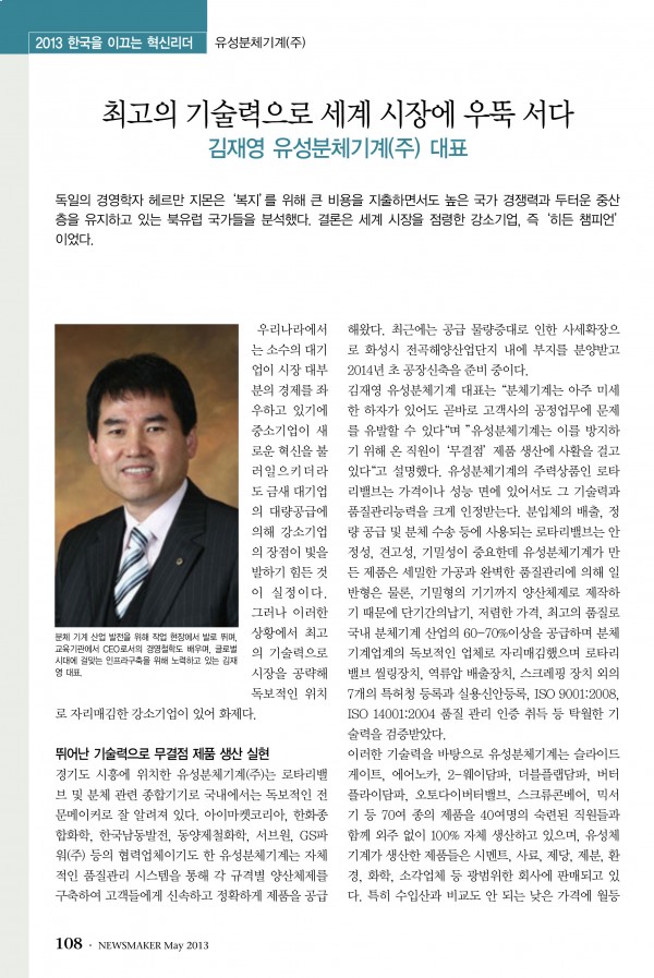 2013한국을 이끄는 혁신리더 선정 페이지 정보 작성자 홈관리자 댓글 0건 조회 3,000회 작성일 13-05-08 17:19 본문 "2013 한국을 이끄는 혁신리더" 선정되어 뉴스메이커 5월호에 수록되었습니다. 목록 이전글2013대한민국 창조경제 파워코리아 보도 13.06.10 다음글화학장치기술/2010년 10월 월간지 10.10.27 댓글목록 댓글목록 등록된 댓글이 없습니다.