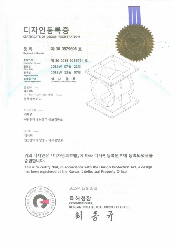 로타리 밸브 입구 디자인 특허등록