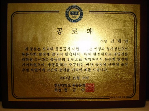한양대학교 총동문회장 공로패 페이지 정보 작성자 홈관리자 댓글 0건 조회 3,747회 작성일 12-02-18 22:35 본문 한양대학교 총동창회장 공로패 (2011. 12. 16 송년회)(경영대학원 G-CEO총동문회 부회장 김재영) 목록 이전글한국산업기술대학교 총장 감사패 12.02.18 다음글효늘사랑나눔회 작은자리복지관장 감사패 11.12.07 댓글목록 댓글목록 등록된 댓글이 없습니다.