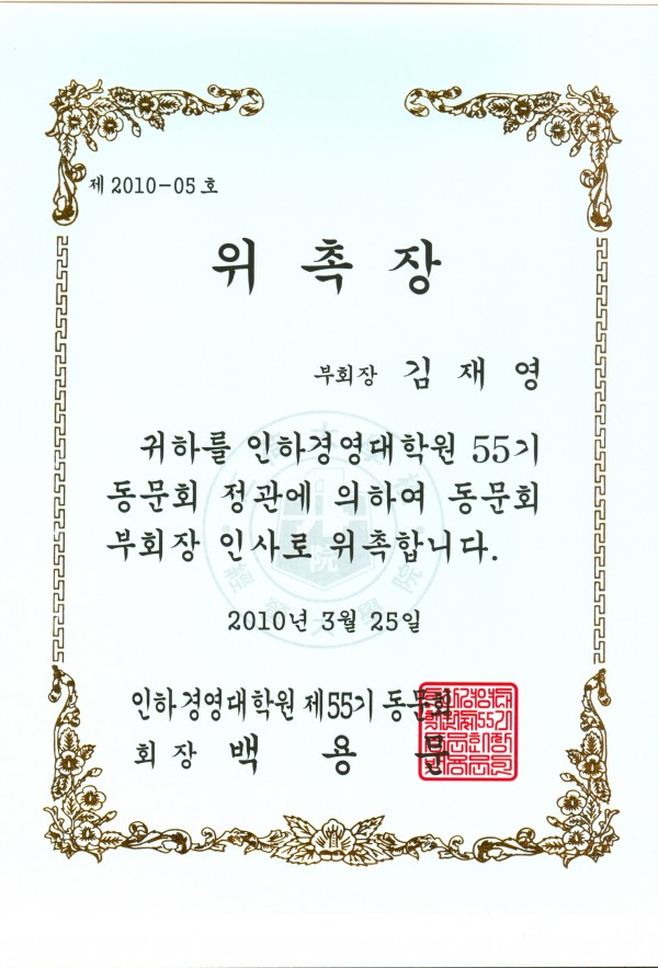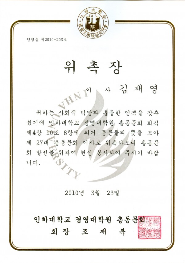 인하대학교 경영대학원 총동문회 이사 위촉 페이지 정보 작성자 홈관리자 댓글 0건 조회 4,826회 작성일 10-03-24 10:33 본문 인하대학교 경영대학원 총동문회 이사 위촉 목록 이전글"2010 대한민국 경영혁신 대상" 상패 10.04.12 다음글인하대학교 경영대학원 학위 수여식장에서 10.03.08 댓글목록 댓글목록 등록된 댓글이 없습니다.