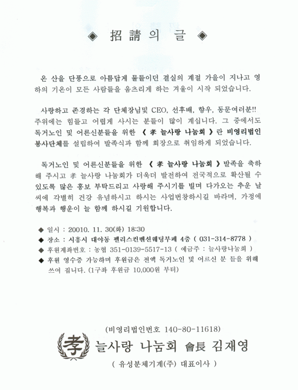 부모, 처부모님에게도 효를 제대로 못하면서 감히 독거노인및 어르신분들을 위한 "孝늘사랑 나눔회"란 비영리법인봉사단체를 설립하여 발족식과 함께 취임식을 하고자 합니다.
