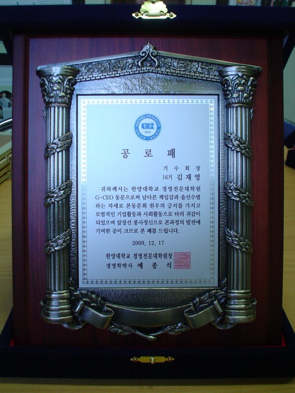 "한양대학교 경영대학원장 공로패"를 수여 받았습니다.