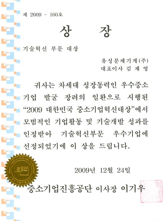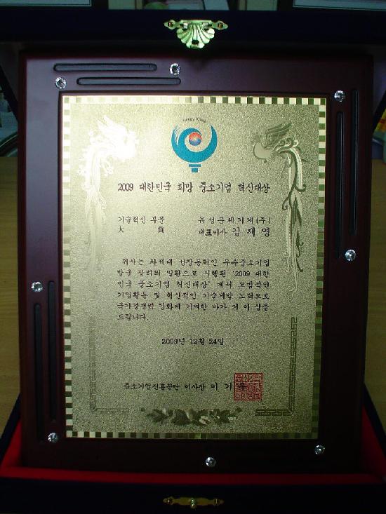 - 시상명 : "2009 대한민국 희망 중소기업 혁신 대상" 수상